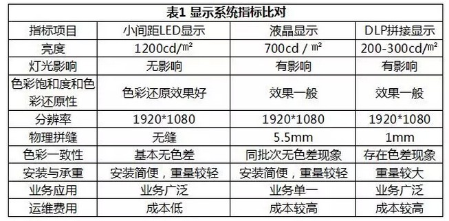 高清晰小间距数字LED显示系统和液晶大屏幕系统长时间使用后屏幕的亮度不会像其他显示系统一样大幅度的衰减,屏幕不需要更换发光器件,相比较而言,在同样亮度情况下,可以节约运维成本。同时,由于高清晰小间距数字LED显示系统设备维护主要为LED单元,而液晶和DLP系统除了发光源外,还有投影及光学部分,因此高清晰小间距数字LED显示系统后期维护成本较低。显示系统指标对比见表1。