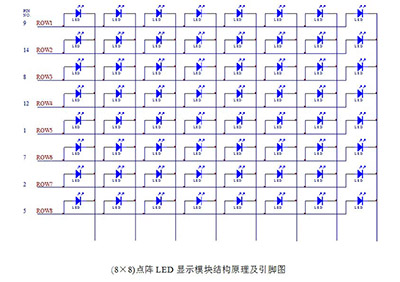 几种LED点阵显示器的内部电路结构和外型规格,其它型号点阵的结构与引脚可试验获得,LED点阵显示器单块使用时,既可代替数码管显示数字,也可显示各种中西文字及符号.如5 x 7点阵显示器用于显示西文字母.5×8点阵显示器用于显示中西文,8 x 8点阵用于显示中文文字,也可用于图形显示。用多块点阵显示器组合则可构成大屏幕显示器,但这类实用装置常通过微机或单片机控制驱动。