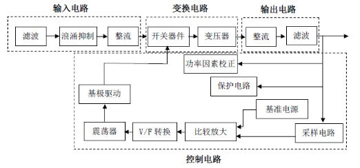 开关电源大致由输入电路、变换器、控制电路、输出电路四个主体组成。如果细致划分,它包括:输入滤波、输入整流、开关电路、采样、基准电源、比较放大、震荡器、V/F 转换、基极驱动、输出整流、输出滤波电路等。实际的开关电源还要有保护电路、功率因数校正电路、同步整流驱动电路及其它一些辅助电路等。
