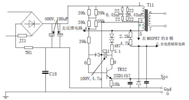 C31 及5.1欧电阻上面的两个二极管用于获得相对稳定的集电极直流偏压(二极管用来整流,电容C31用来滤波),基极偏置取自输入电路的直流电压。A(由4-5绕组的5边直接引出,去反馈电路)、C(去电流极限电路)点用于提供其它辅助控制的上偏电源。电源去耦电容(VCC和GND之间的电容)建议为10—47uF,启动电流不少于300uA。