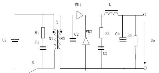 为防止变压器T磁饱及快速恢复,原边使用了简单的R1C1释放电路。副边VD1 整流,VD2 续流,C2去耦,L、C4滤波,R3C3、R4为辅助泄放通路。
