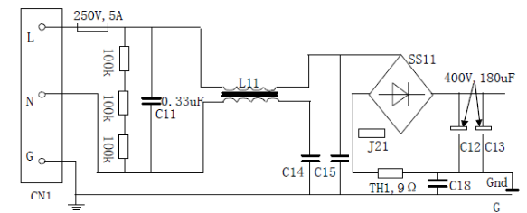 包括线性滤波电路、浪涌电流抑制电路、整流电路三部分。