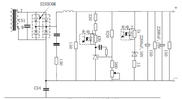 电源输出电压由光电1、基准电源器件及电位器部分来控制,调节电位器可以在一定范围内调整输出电压。
