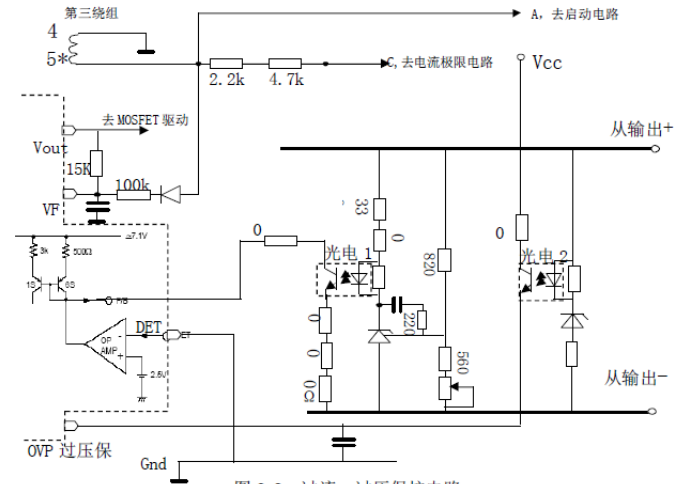 光电2、稳压管部分用于获得反馈OVP 信号,稳压管的稳压值决定了OVP 保护动作点。